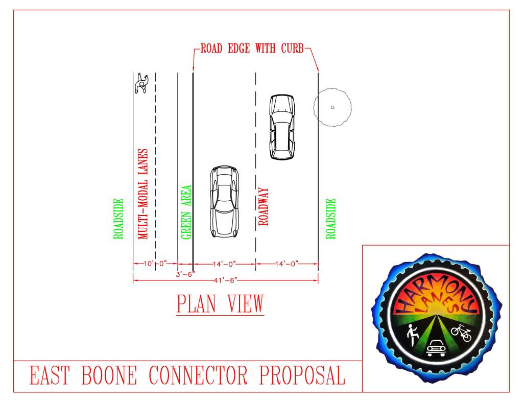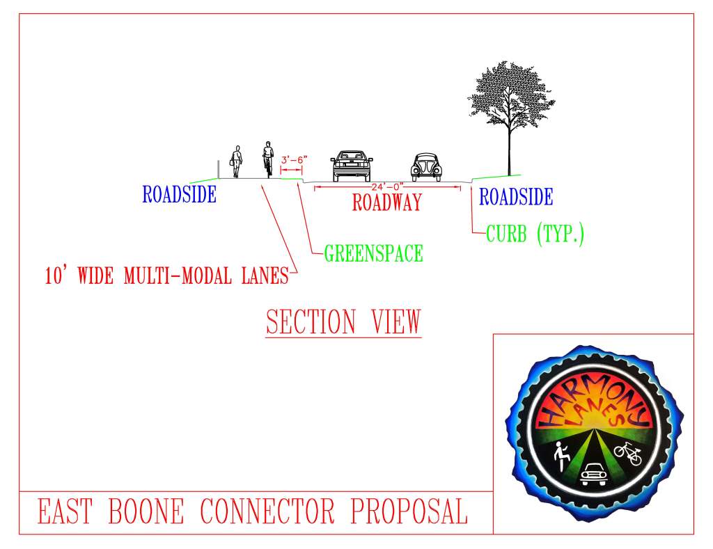 Harmony Lanes is excited to announce that the East Boone Connector multi-modal path, proposed to the NCDOT in the spring of 2019, has been added to the plan for the Bamboo/Wilson’s Ridge road upgrades by the NCDOT, and will be paid for by the NCDOT. The East Boone Connector will run on the west side of Bamboo Rd. from US 421 to the Wilson’s Ridge intersection. The multi-modal path will be separated from traffic by a curb and grass/landscaping to protect users. The East Boone Connector will be the first on-street protected multi-modal path in Boone. It will allow East Boone pedestrians and cyclists to access the Boone Greenway, services like the Hospitality House and businesses like Center 45 climbing gym and Hatchet Coffee at Bamboo Rd., the future town complex at Brookshire Park, the future Grove Street connector greenway, and Rocky Knob Mountain Bike Park. The NCDOT project will start with right of way acquisition in 2020 and should finish within 3 years. Initially, the East Boone Connector would have needed up to 30% matching funds from the Town of Boone and Watauga County, but the NCDOT has elected to include and pay for the path since it fits with their Complete Streets policy. Thank you NCDOT! Protected multi-modal paths incorporate barriers and green space to separate and protect walkers and bikers from vehicle traffic. This is a benefit to drivers also because every person you see in the path represents one less car on the road with you. Also, safety for bikers, walkers, and drivers is significantly improved, and safe corridors increase the percentage of people who will choose to navigate Boone by human power. With Boone’s traffic and growth challenges, increasing ASU enrollment, and the international problem of climate change, installing more on-street multi-modal paths makes sense. Harmony Lanes is working to link the Boone Greenway, Middle Fork Greenway, ASU, and town with more protected multi-modal infrastructure to connect the many population centers to each other. Harmony Lanes thanks everyone in the Boone community who helped form and articulate the plan for the East Boone Connector, especially the many residents who emailed the NCDOT supporting the proposal, Mike Pettyjohn and Ramie Shaw at the NCDOT for helping adjust the proposal to work with the overall project, and Taka Omori for mapping the East Boone Connector. Harmony Lanes is a new 501c3 non-profit. The mission is: Create safe, inclusive multi-modal infrastructure. Harmony Lanes is actively soliciting members for the organization to build toward making Boone a safer place to walk/run/bike/skate/scoot for our unusually active population. Sign up information is on the website at https://harmonylanes.org/membership/.